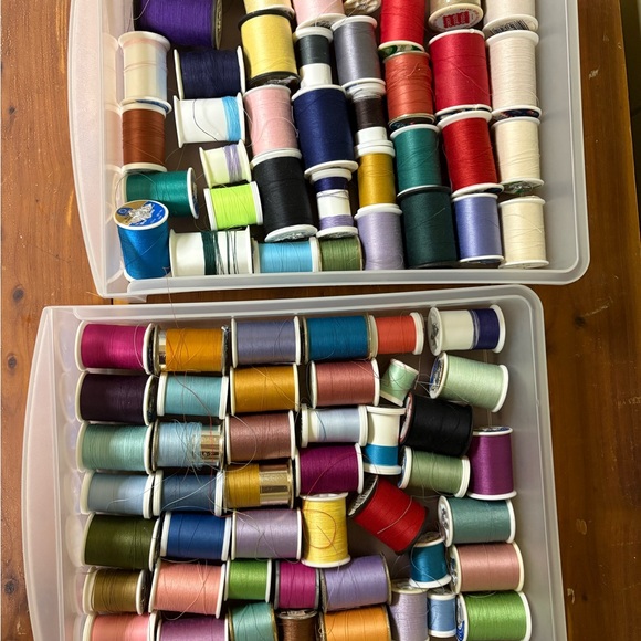 Over 80 spools of thread in a variety of colors. Perfect for the seamstress or crafting.