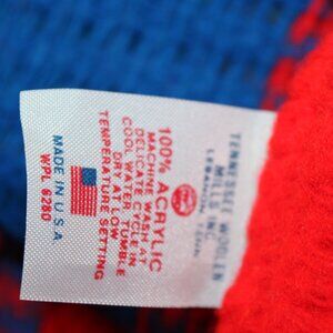 This colorful blanket made by Tennessee Woolen Mills, Inc. and is 100% acrylic. It measures 94 inches long by 65 inches wide, queen bed size. There are no holes or lose strings.