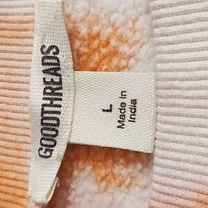 Good Threads Vibrant tie-dye sweatshirt. Features pink and orange hues. Perfect for casual wear.