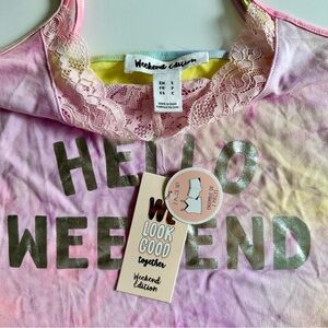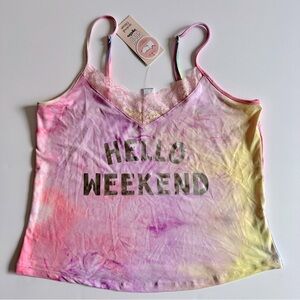 Vibrant tie-dye pajama set with 'Hello Weekend' print. Features a camisole and shorts in pink, blue, and yellow hues.