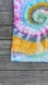 JRS Designs Ltd Tye dye throw quilt featuring pink, light blue, yellow and dark blue spiral with striped print backing with spiral quilting. Front material is light stretchy sweatshirt. Handmade in Maine with ❤️ upcycled materials used. Measures 33.5”x 23.5”in baby throw. All quilts are different sizes depending on the materials used to make them.