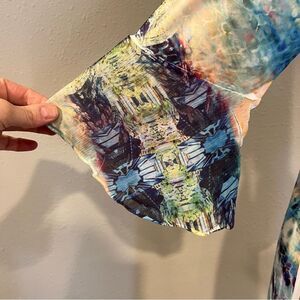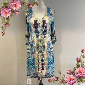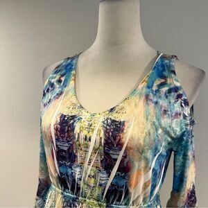 Vibrant tie-dye dress with cold shoulder design. Features a mix of blue, yellow, and pink hues.