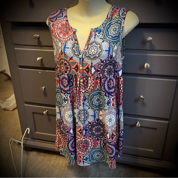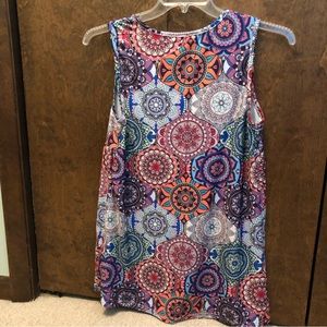 Fun floral and patterned sleeveless top with button detail and v-neck. Gathered empire waist. Like stained glass windows. Like new! Seems to fit more like a medium. Pit to pit is approx 19” unstretched. Length approx 29-30”. Loveu Dear.