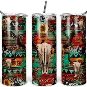 Add a touch of rustic charm and vibrant style to your daily routine with this exceptional Aztec Sunflower Bull Skull tumbler!