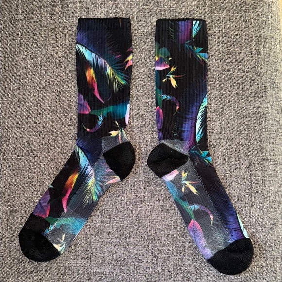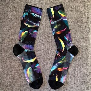 Vibrant socks with a tropical leaf design. Perfect for adding a pop of color to any outfit. Comfortable and stylish.