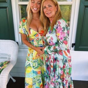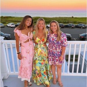 Vibrant dress with a tropical print. Features green, orange, and blue hues. Perfect for a sunny day.