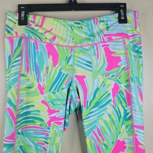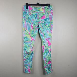 Vibrant leggings with a tropical leaf pattern. Features shades of pink, green, and blue. Perfect for a bold, stylish look.