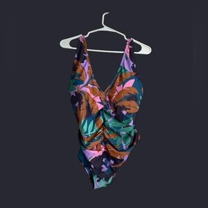 Vibrant one-piece swimsuit with a tropical print. Features shades of purple, green, and brown. Has a cinch detail in front and back.
