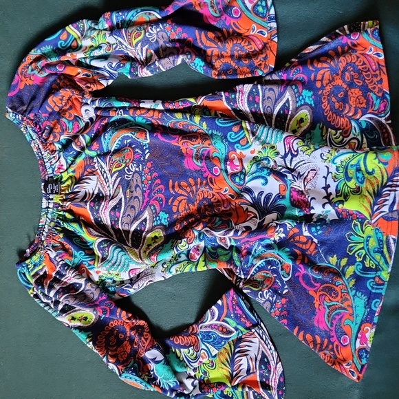 Very comfortable, stretchy and soft. Elastic neck line, can be worn off shoulder. Long, flared sleeves. Dark blue, orange. pink, green, white. brown. In great used condition.