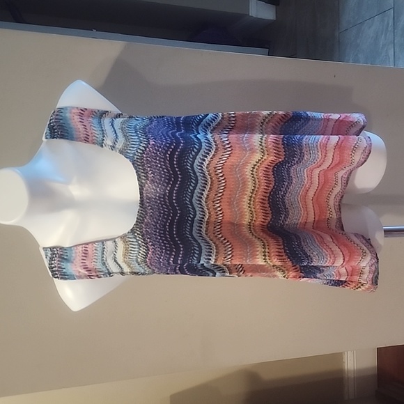 Colorful Tunic Top with sheer cut-out in the back. Crochet details on the around this Sleeveless Tunic.