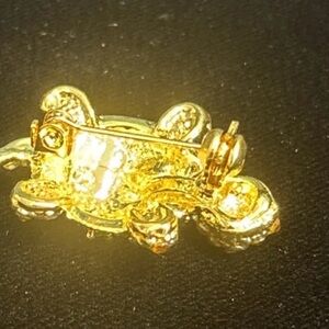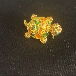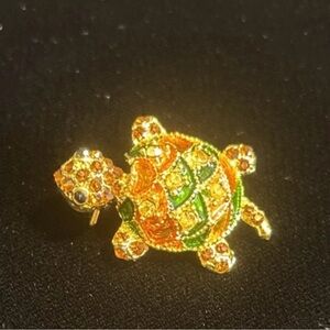 Sparkling turtle brooch with orange, green, and gold accents. Perfect for adding a touch of whimsy to any outfit.