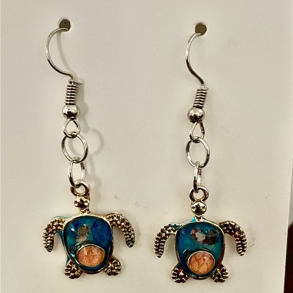 Add a splash of color to your outfit with these vibrant turtle dangle earrings. Perfect for any occasion.