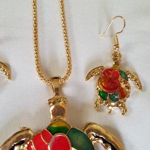 This is a Super-Cute and Beautiful Multicolor Turtle Necklace With Matching Earrings. Gold-tone hardware. Fishhook closure Earrings.