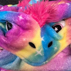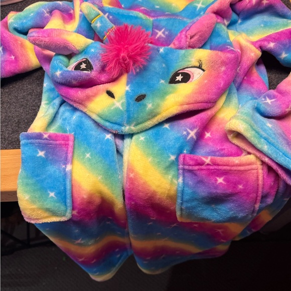 Vibrant unicorn robe with rainbow colors. Features a playful unicorn hood and pockets. Price is for both things