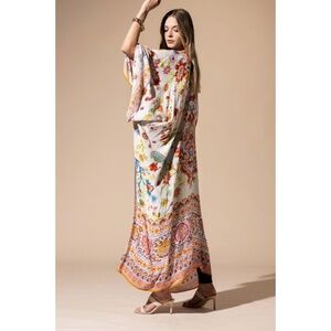 Elevate your spring and summer wardrobe with our lightweight floral duster kimono. This exquisite piece blends delicate floral and intricate border prints with a subtle gold shimmering threading in a flowy and vibrant design, capturing the essence of the season. Perfect as a cover-up or a stylish layer, its timeless beauty and captivating colors embrace the spirit of spring. Embrace the allure of nature's artistry and step into the season with elegance and grace.