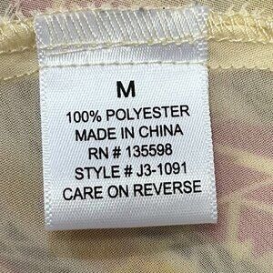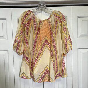 Wishful Park blouse with geometric patterns. Features shades of pink, yellow, and cream. Great looking top, light material, slight elastic in sleeve, in great condition. Measures 21 1/2 inches from armpit to armpit.