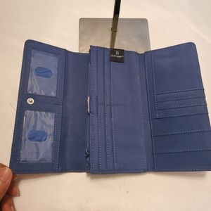 Wallet with plastic coating. Pockets for cash, receipts and coupons. Inside clean but missing a piece of material. Brand is known for RFID to protect your cards information. Still has lots of life and love to give. Great wallet . Ask questions before purchasing.