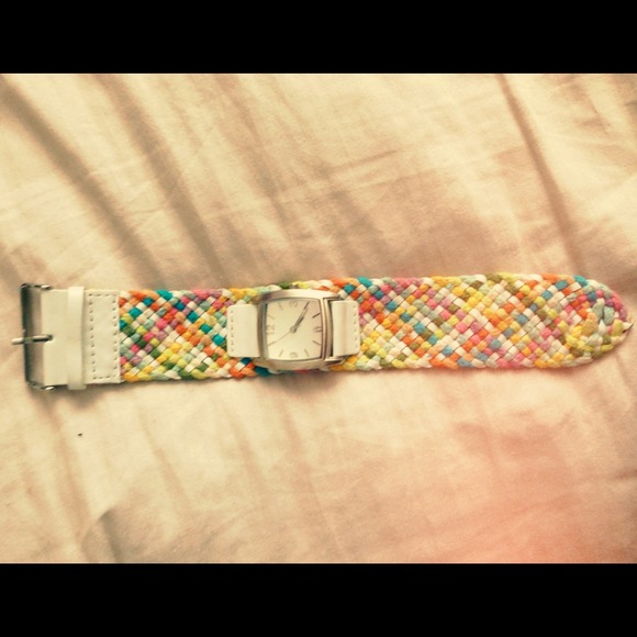 This colorful watch is extremely cute for summer or spring. The arm band is made of cloth like material and is weaved. This has never been worn.