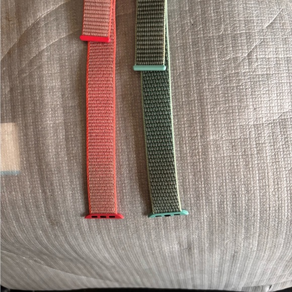 One band is aqua green the other is med orange. All new, fits a 40mm and 42 mm