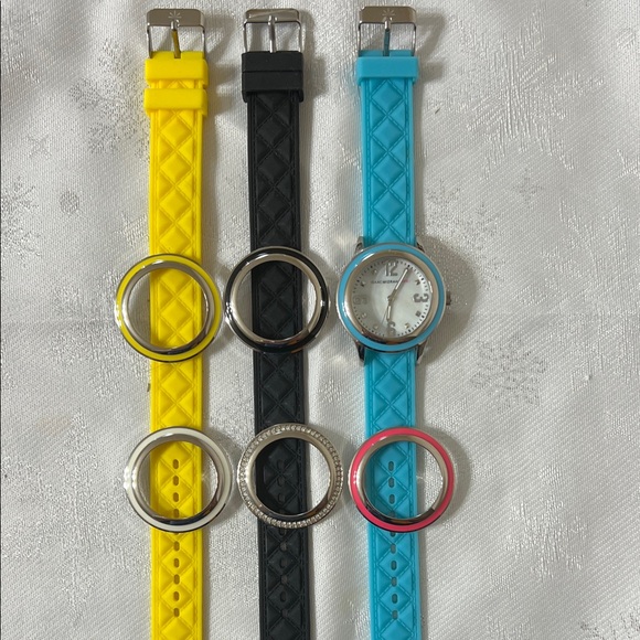 Brighten up your day colorful watch set. Featuring vibrant yellow, black, and blue bands, this set is perfect for any occasion. Easy to wear and fun to mix and match. Japanese movement . New battery