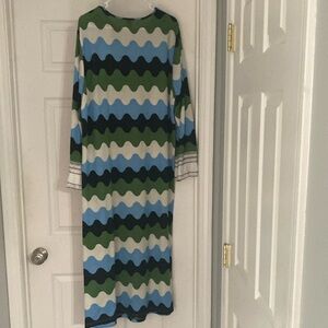 Stylish dress with wave patterns. Features green, blue, and black colors. Perfect for casual outings.