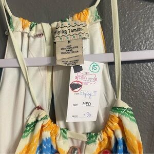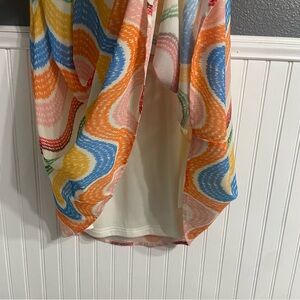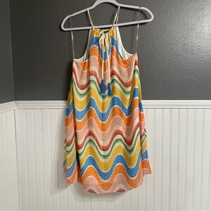 Vibrant dress with a playful wave design. Tie neck.