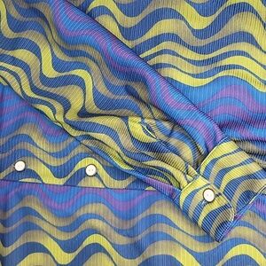 SMASH men's vibrant button-up long sleeve shirt with wavy pattern, size XL, shirt length 31", sleeve length 22.5", chest width 24", shoulder width 21", armpit to armpit 23", bottom width 21.5", pre-owned in excellent condition.,smoke-free home.
