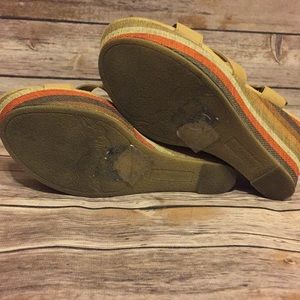 Like new. I don’t think I ever actually wore them out. Really cute color bands on the wedge goes great with the nude straps.