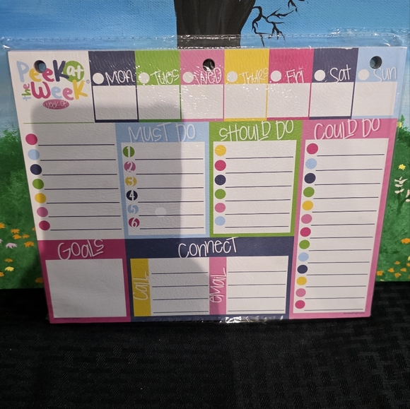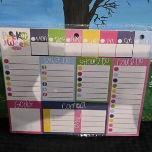 Bright and colorful weekly planner pad. Features sections for goals, must do, and more.