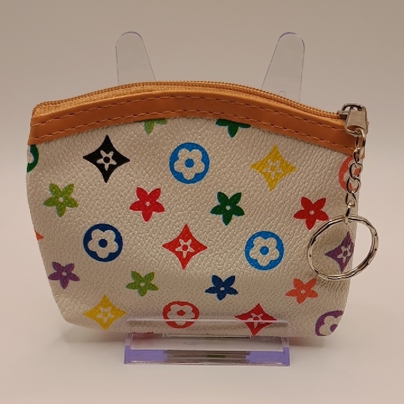 Stylish white coin purse with a colorful pattern. Features a keychain attachment.