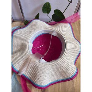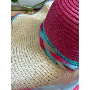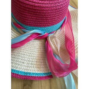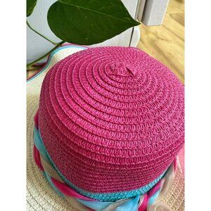 Bright and playful woven sun hat featuring a pink crown, cream brim with teal and pink trim, and flowing sheer ribbons in pink and aqua. Perfect for summer outings, dress-up, or adding a cheerful touch to any outfit.
