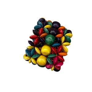 Unique handmade bracelet that appears to be made from dyed wood. It's a wide bracelet with bright colors in pink, purple, blue, yellow, green, orange and teal. The beads are woven on stretchy elastic cording and will fit most wrists. 2 1/2" wide