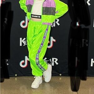 Vibrant windbreaker jacket and pants with green, purple, and black panels. White top for under jacket included. Perfect hip hop costume for a bold look.