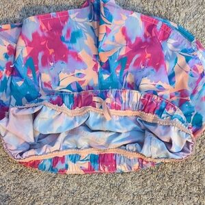 Vibrant women's athletic shorts featuring a lively pink and blue pattern. Perfect for workouts or casual wear.