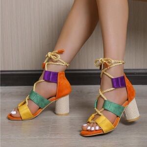 Step out in style with these vibrant block heel sandals. Featuring a mix of orange, green, and yellow, these shoes are perfect for adding a pop of color to any outfit. The comfortable block heel ensures all-day wearability.