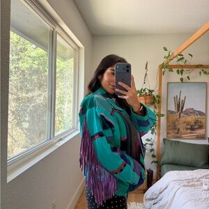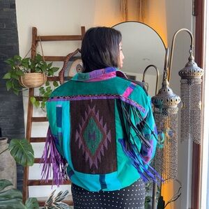 Vibrant and stylish Santa Fe Re-creations vintage this colorful women's patchwork jacket is perfect for making a statement. Featuring a unique blend of teal, purple, and black, this jacket adds a pop of color to any outfit. Ideal for those who love bold fashion choices.