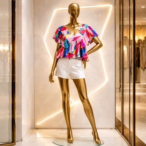 Vibrant and stylish, this colorful ruffle top is perfect for any occasion. Featuring a mix of pink, blue, red, and green hues, it adds a pop of color to your wardrobe. Ideal for pairing with jeans or skirts for a chic look.
