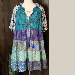 Colorful Women’s Silk Dress Made in India midi length tassel tie detail Size M-L
