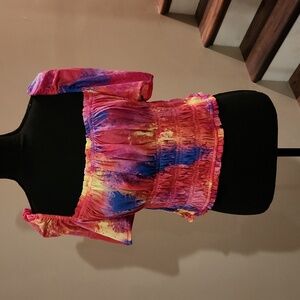 Vibrant women's top featuring a mix of red, pink, and blue hues. Ruching around the waist. Perfect for adding a pop of color to your wardrobe.