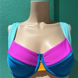 Vibrant and stylish bikini set featuring a mix of blue, pink, and yellow colors. Perfect for making a statement at the beach or pool.