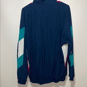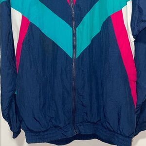 Vibrant women's jacket featuring a striking combination of blue, pink, and teal. Perfect for adding a pop of color to your wardrobe.