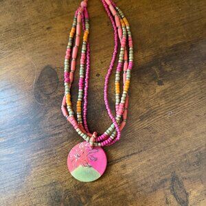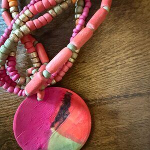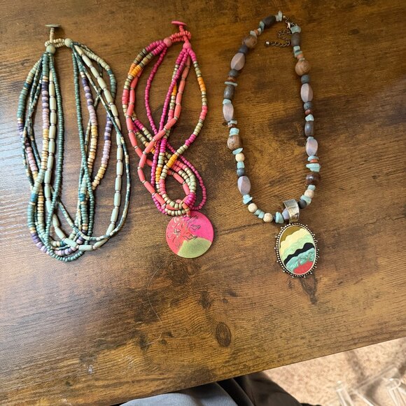 This is for 3 Wooden Beaded Necklaces, 2 have pendants and one does not. One has a hooks closer and to have buttons. All 3 are earthy toned. Great addition to any night out.