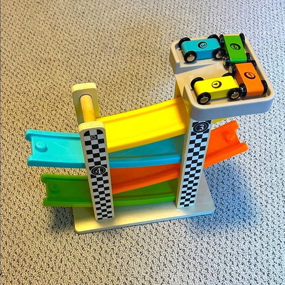 This vibrant wooden car ramp racer set is perfect for kids who love speed and fun. Featuring a multi-colored track and four mini cars, it provides endless entertainment. The bright blue, yellow, green, and orange colors make it visually appealing and engaging for children.