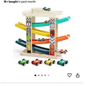 Delight your child with this vibrant wooden car ramp racer set. Featuring yellow, green, and blue cars, it's perfect for endless racing fun. A great addition to any playroom.