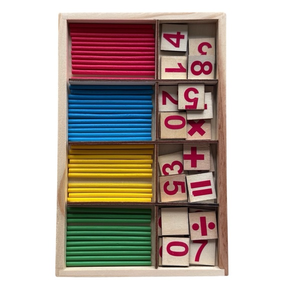 Engage your child with this vibrant wooden math learning set. Featuring red, blue, yellow, and green pieces, it's perfect for developing early math skills. Ideal for hands-on learning and fun.
