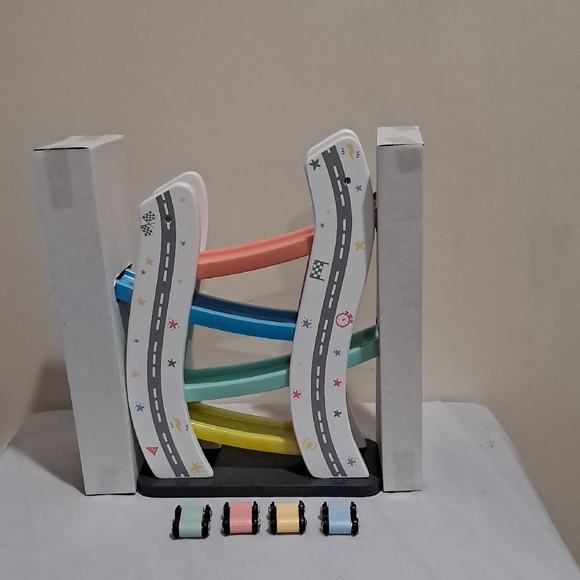 This vibrant wooden ramp racer toy features a fun and engaging design. The colorful tracks and cars provide endless entertainment for kids. Perfect for developing motor skills and coordination. Includes Ramp & 4 Small Cars (I Opened Package To Show What Ramp Looks Like It Is Brand New Never Used) Please Check Out All Photos