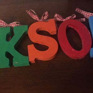 Each letter painted with red/white ribbon hanging from back (can be removed)