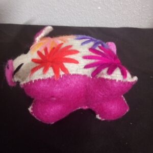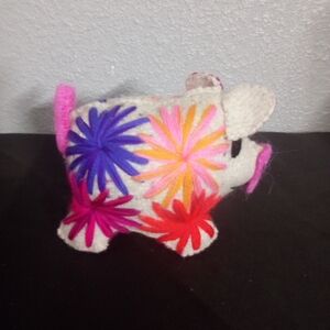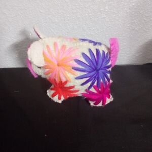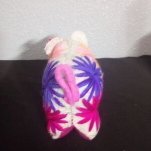 Adorable wool plush toy with vibrant floral patterns. Features purple, pink, orange, and red flowers on a cream background. Perfect for decoration or play.