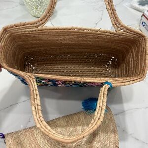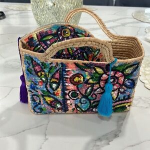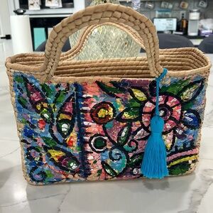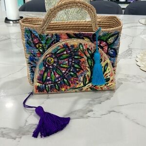 Colorful Woven Hand Painted Shoulder Bag with Floral Taco Shaped Clutch.