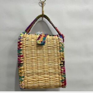 En Shalla Stitch-Trimmed Basket Bag Woven Straw Wicker